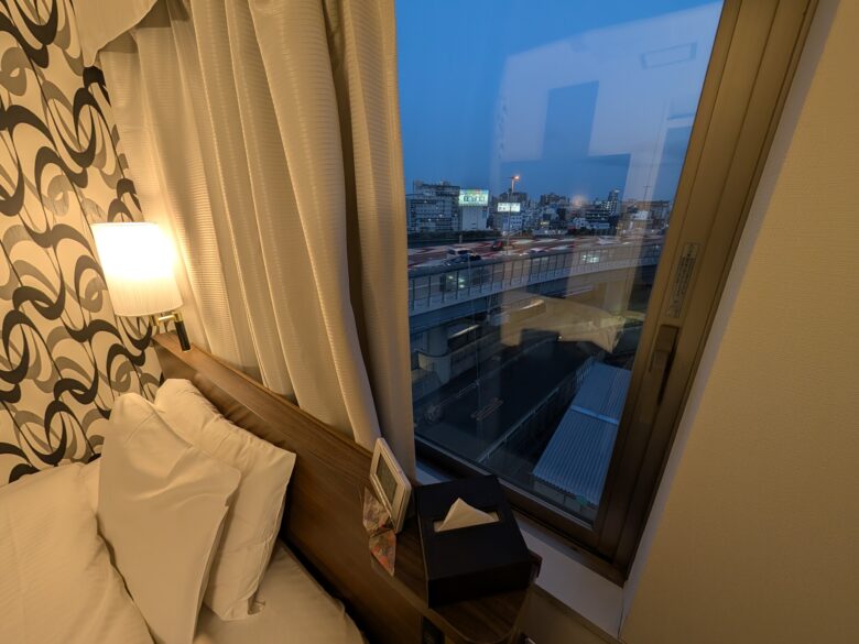部屋は冷蔵庫など付いており、BSやVODつきテレビなどがあります。景色的には高速がもろ見えますね。