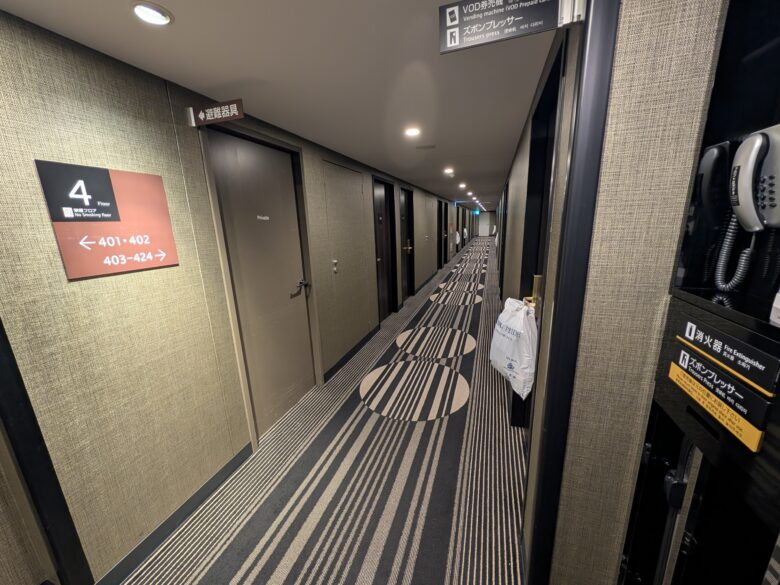 1階にコインランドリー・製氷機・電子レンジ・自販機などが揃っており、2階から6階が客室です。