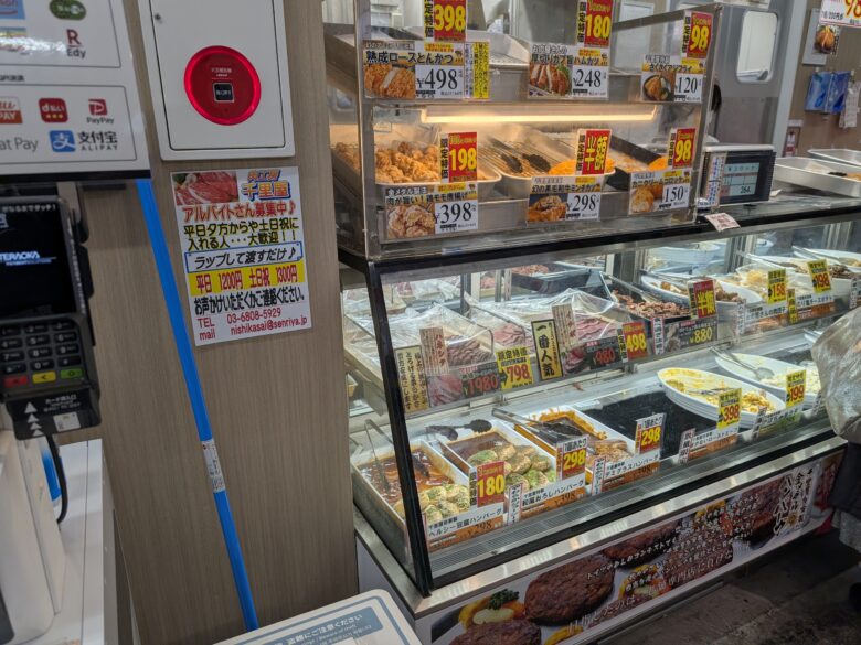 先まで行くと西葛西場外市場があり肉や魚の惣菜なども売っています。
