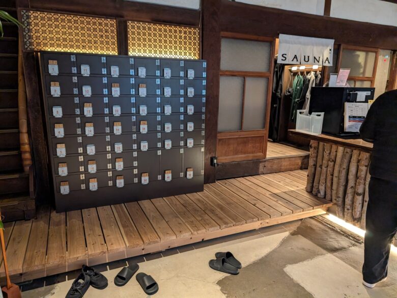 入って下駄箱に靴を入れます。スタッフの方から説明を受け、鍵などをもらって中に入ります。あと精算で料金がかかるシステムです。