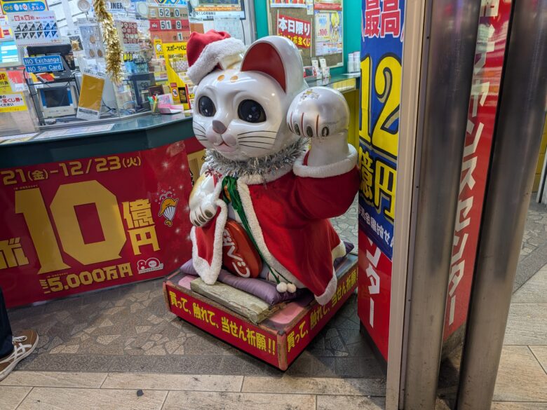 売場の前に鎮座する福の神『新ちゃん』。幸運を呼ぶ招き猫として親しまれていますが、西銀座チャンスセンターから移動してきたみたいです。