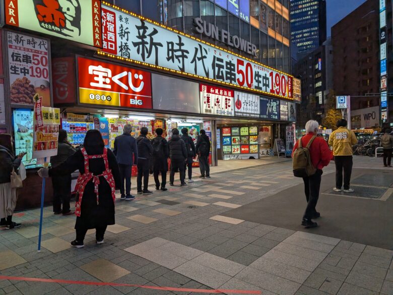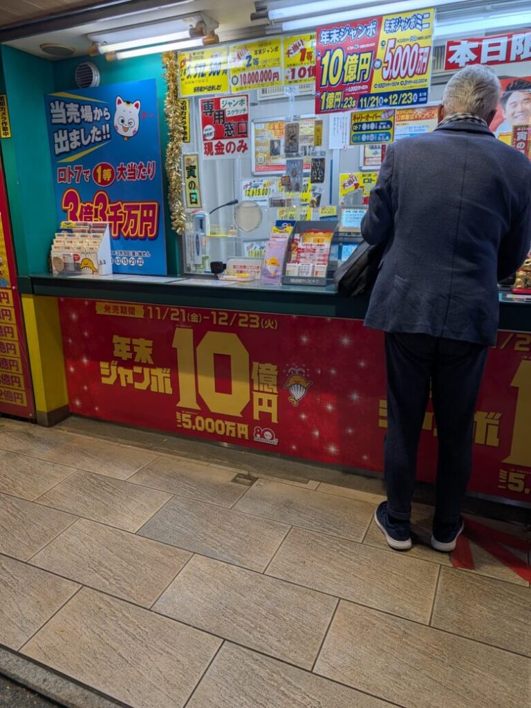 この日は年末ジャンボの発売最終日の12月23日夕方でしたが。10人くらいの行列でした。西銀座チャンスセンターなどは1時間など待つという話もあるので、こちらは比較的すいてそうです。